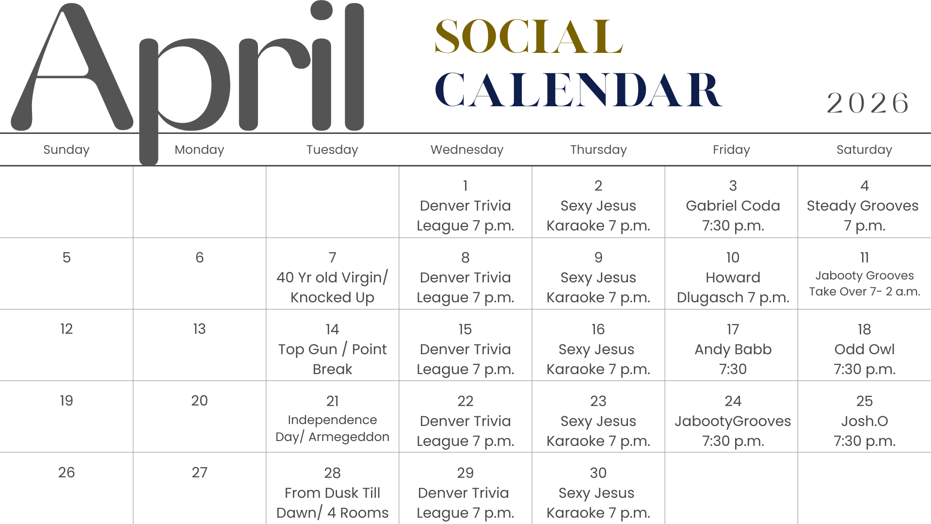At Olde Town Social, we don’t just offer inspired libations and delicious food—we’re dedicated to bringing you the best in live local entertainment! Enjoy a diverse lineup of events, from live music and karaoke to movie screenings and trivia nights. No matter when you visit, there’s something for everyone in your group to enjoy. Come for the great food and drinks, and stay for the unforgettable experiences!